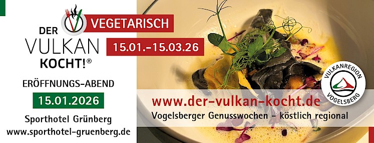 Kreative Gastronomen der Vulkanregion Vogelsberg wollen ihre Gäste mit pfiffigen, durchaus klassischen, aber auch neu kreierten vegetarischen Gerichten aus regionalen Zutaten begeistern. WIR SIND AUCH DABEI! Dass sich unfassbar viele Variationsmöglichkeiten hinter all dem verbergen, was die Vogelsberger Vulkanerde hervorbringt, kann man im Rahmen der kulinarischen Genusswochen „Der Vulkan kocht!®: vegetarisch“ probieren.